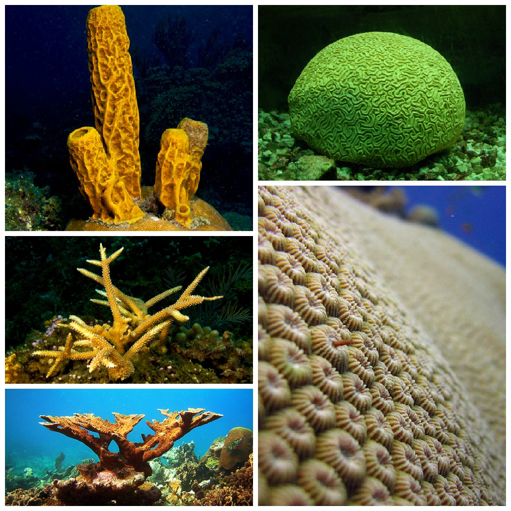 Clockwise from top left: Tube coral, brain coral, great star coral, elkhorn coral, and staghorn coral