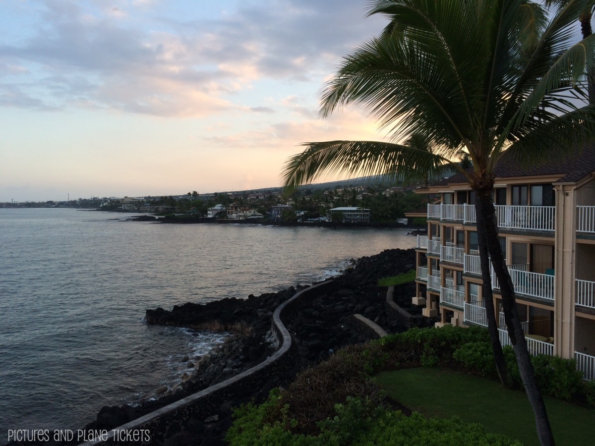 The perfect alternative for us is renting a condo when we travel. You’d be surprised but most condos include all of the standard amenities of a typical hotel, from a pool to an exercise room, and the grounds of the “resort” are usually well landscaped. My favorite part of renting a condo is having a kitchen to cook breakfast or dinner, so we can try to save a little money on food expenses. While in Kona we stayed in a condo that had this view: