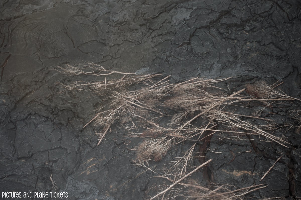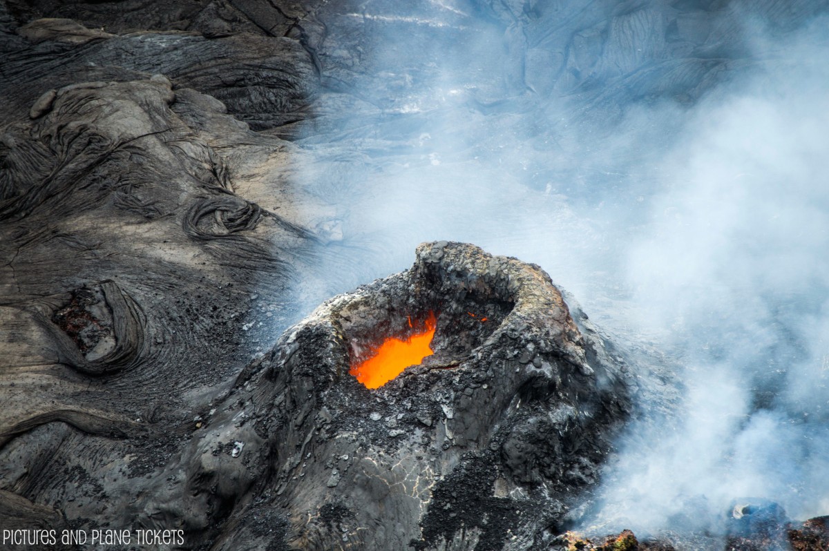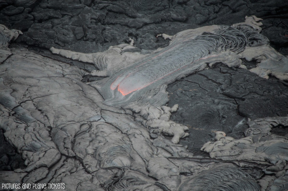 The first glimpse of lava took my breath away. The contrast of the bright orange-red glowing lava slowing oozing over the hard black rock was intense and incredibly exciting. As we flew over the Pu’u O’o vent we were able to see the bubbling hot tub of liquid rock constantly sputtering and spewing below.