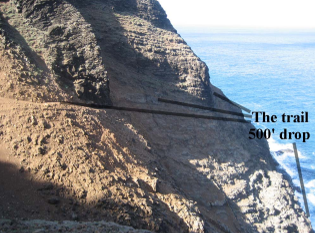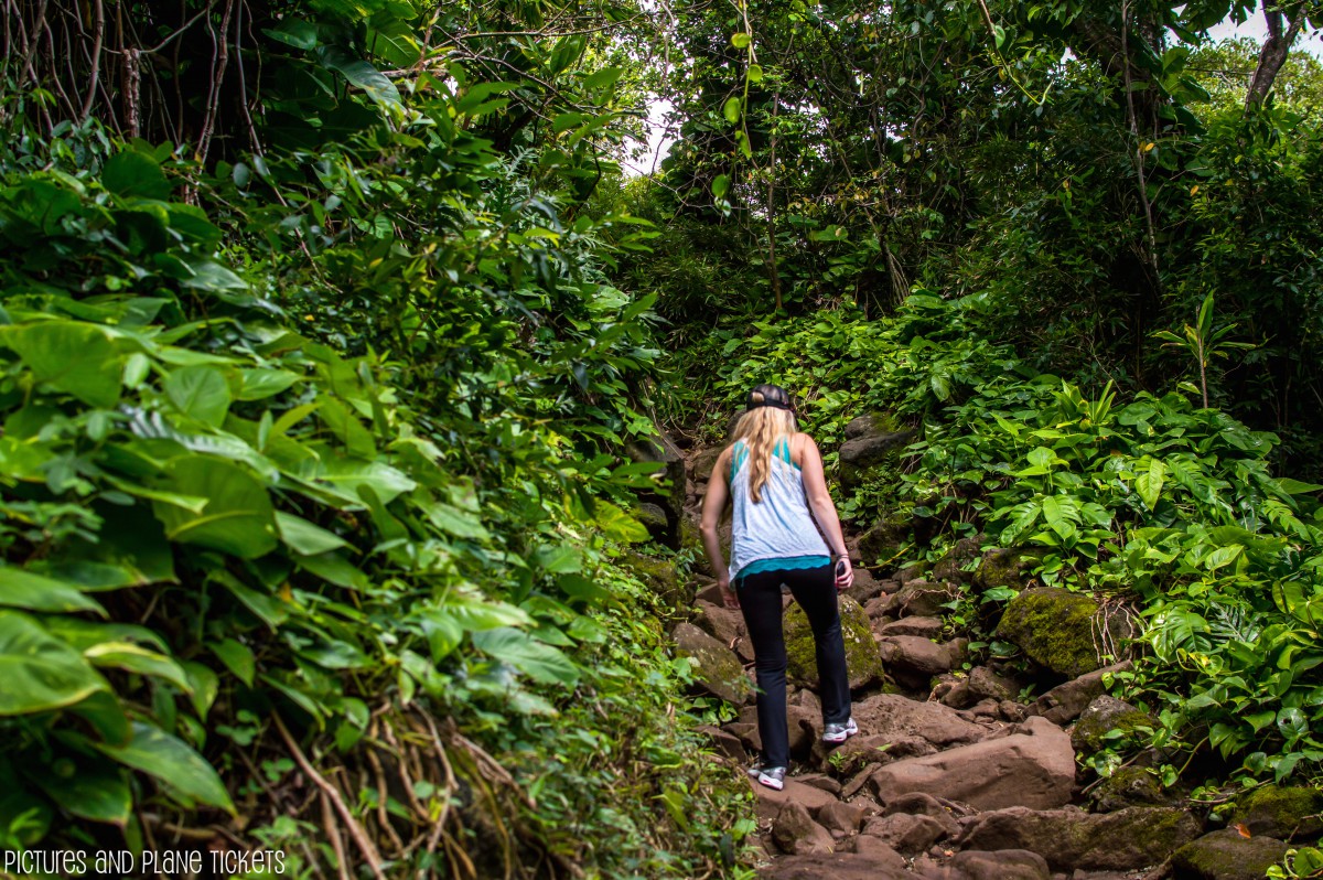 See the thing about the Kalaulau Trail is that there is no slow incline, or anything gradual or “easy” about it. Within the first two miles you go from sea level to 500′ and back down to sea level. The trail is never “level” as it crosses towering cliffs and deep valleys along the rugged and remote NaPali Coast. And those first two miles are probably two of the easiest miles.