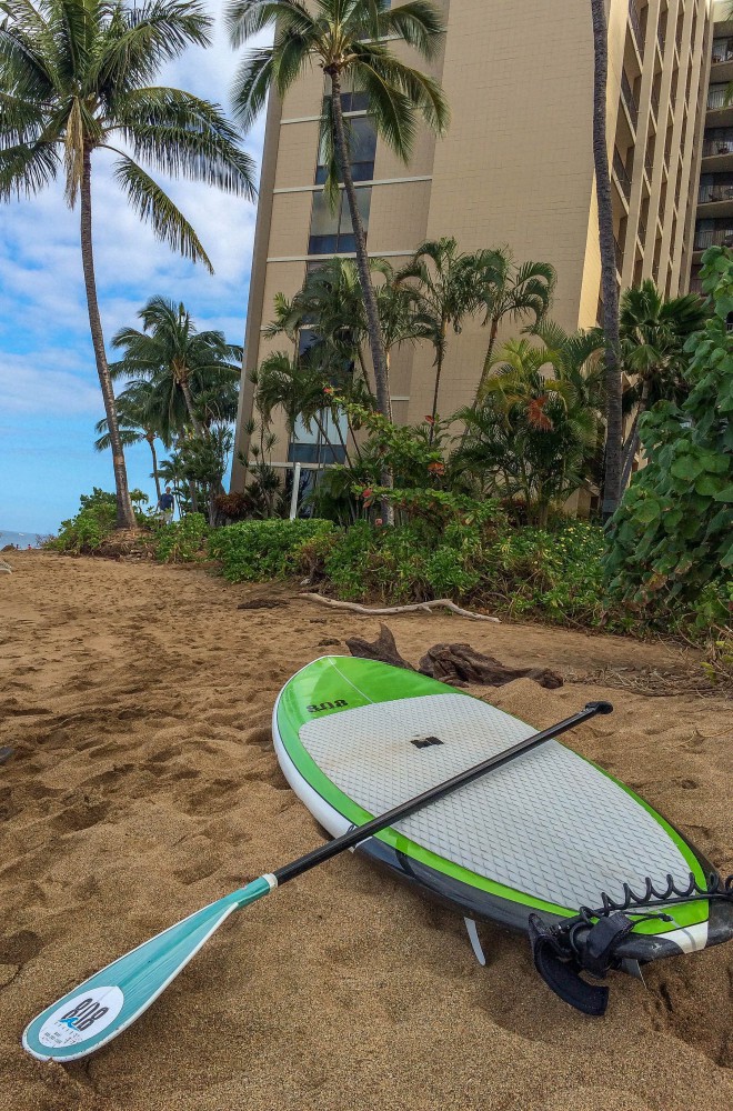I made the call to 808 Boards and talked to Danny who happily asked what kind of paddleboard we wanted… uhhhh….. ?? Good question. How about one that floats and comes with a paddle. 🙂 When I explained that we had no experience and I didn’t know what board to rent, Danny suggested the perfect starter board (it’s a ten x 32 if you’re wondering). A 24-hour rental is $45, and the best part about it?? Danny delivered it right to our condo because we were so close to their location in Napili. Thanks, Danny!!