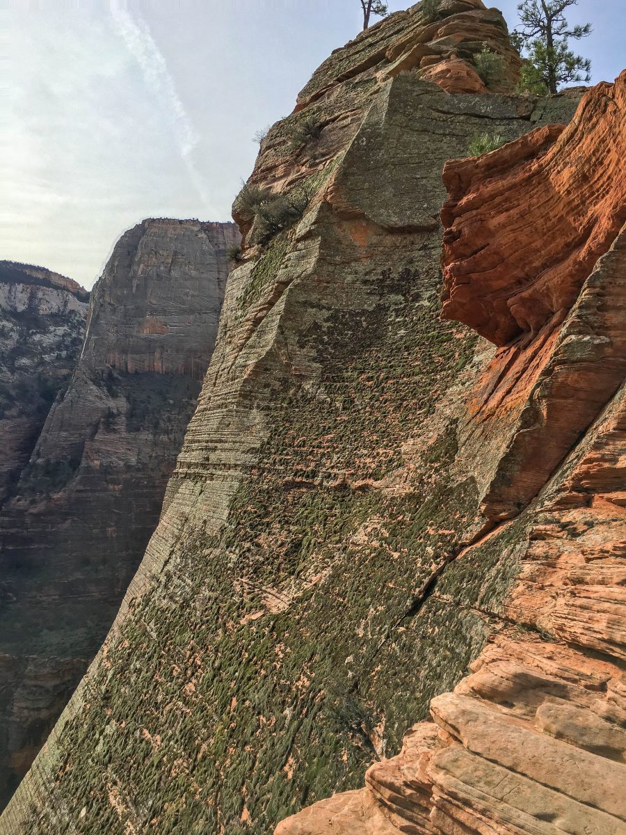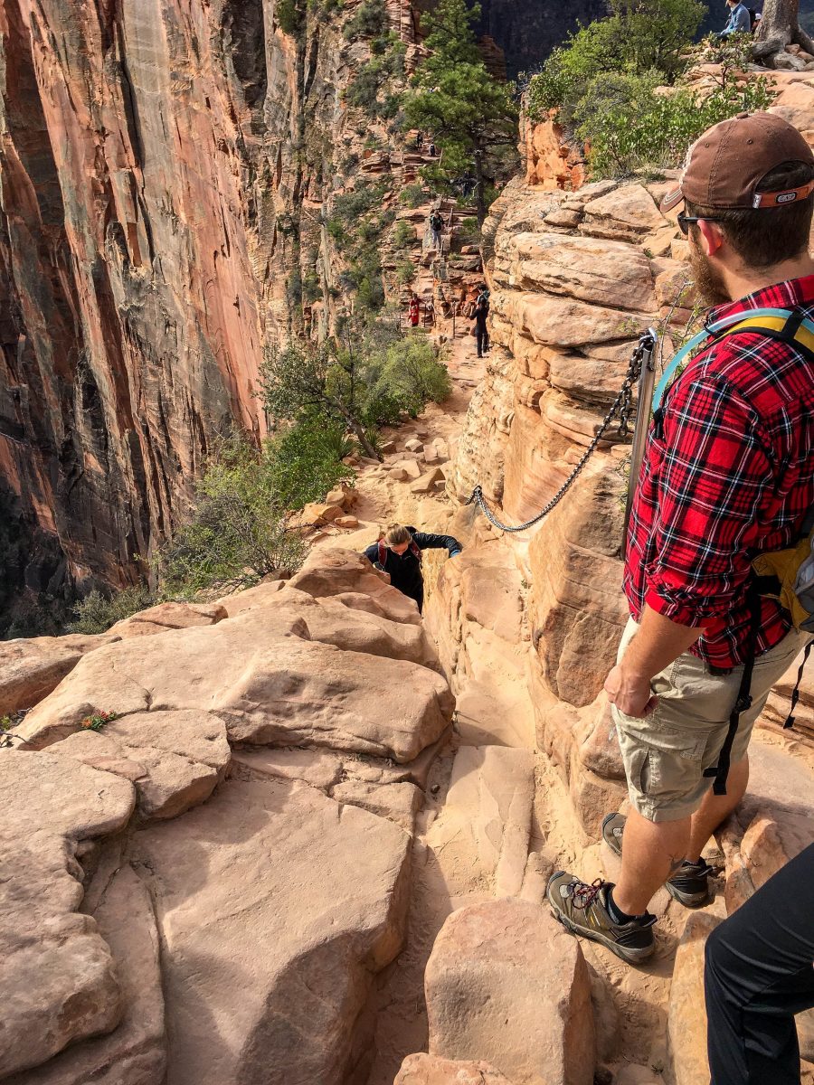 To put it simply, the last half-mile of the Angel’s Landing hike is intense. The thrilling trail is small and filled with tiny ledges the width of balance beams. The sheer drop offs are always present in your mind as you scale boulders, balance on ledges, and use the steel chains — which are bolted into the rock — to hoist yourself up to the next ledge. The canyon floor looks incredibly ominous, so on the way to the top I did the most logical thing and just reminded myself to look up and focus on the next hand hold to distract myself from looking at the canyon floor 1,400 feet below.