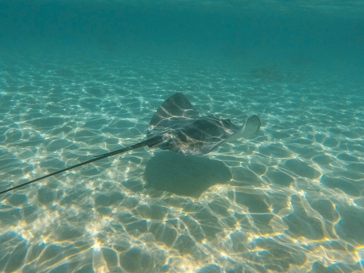 We arrived at the shallow sandbar and a group of sting rays surrounded our canoe by the dozen. Romain was not only our captain for the day but also our personal sting ray expert, and he was the first one into the water as he began feeding the rays. These large, grey creatures snuggled close and pushed themselves onto his chest as I stood by and watched in wonder. I couldn’t help but compare the rays to big puppy dogs — albeit much more rubbery, slightly more slimy, and with much sharper tails. 😉