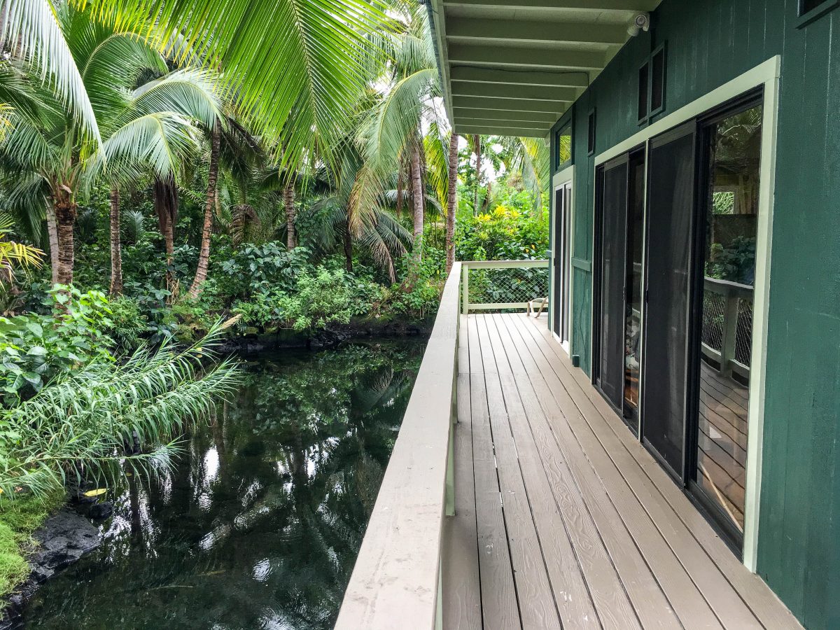 We chose the Kapoho Tiki Cottage because of its location in secluded Kapoho — 30 minutes south of Hilo, a palm-tree-lined drive gives way to a quiet community fronting the famous Kapoho Tide Pools — and just inside the gorgeous community is the Kapoho Tiki Cottage. This one bedroom cottage is spacious, very clean, and has a plethora of amenities for your stay, including: a grill, a picnic table, beach towels, a cooler, beach chairs, guidebooks, and the cherry on top is that it has its very own fish pond.