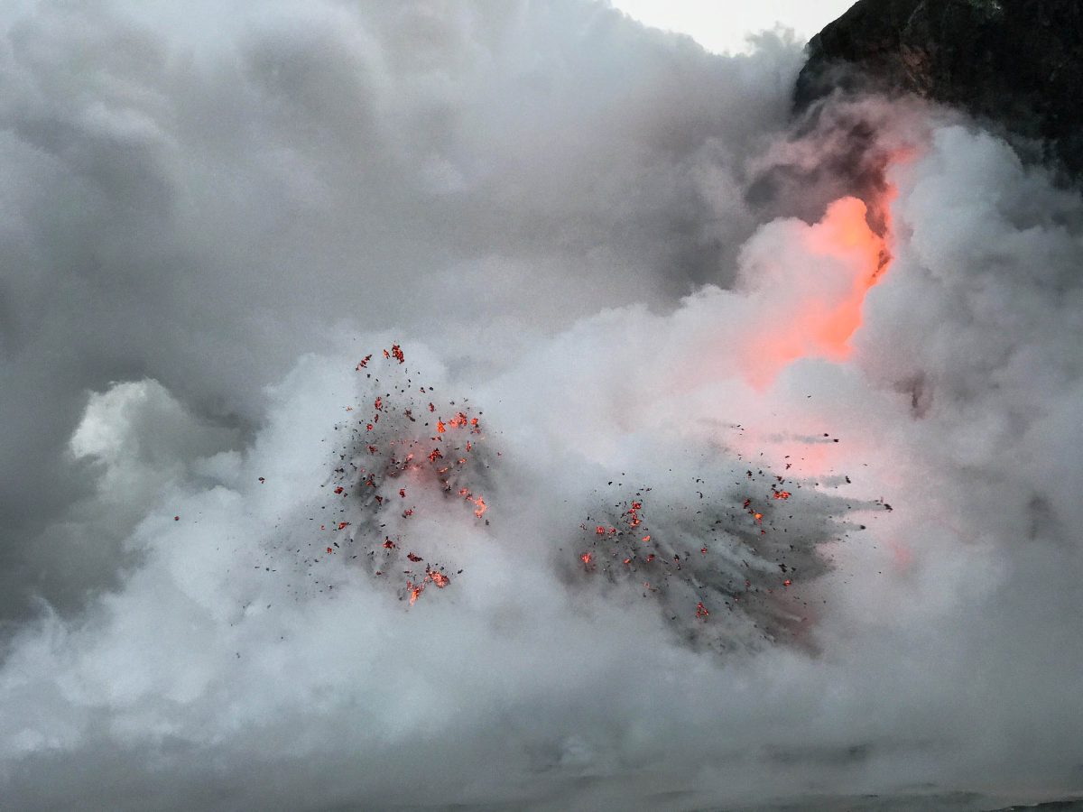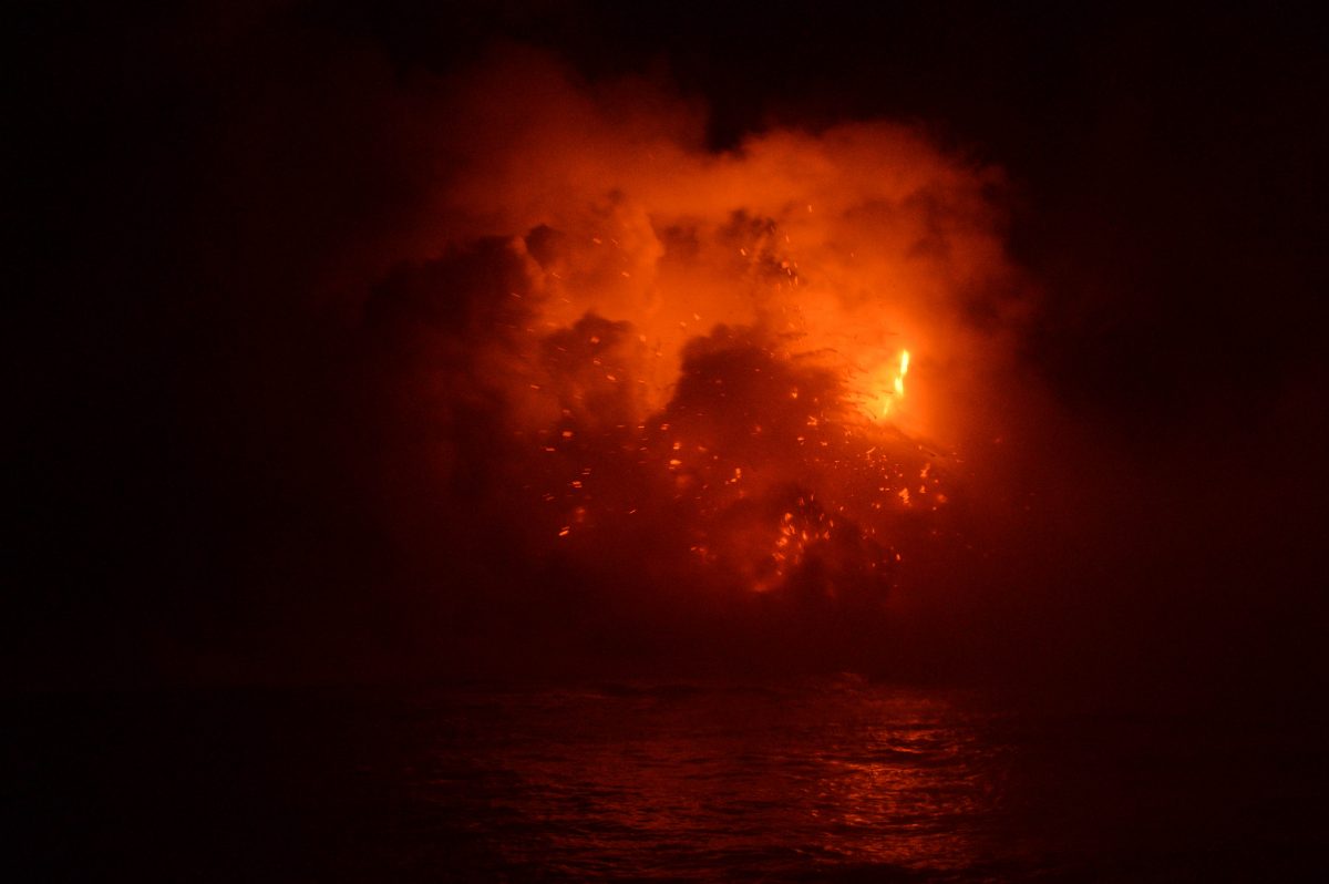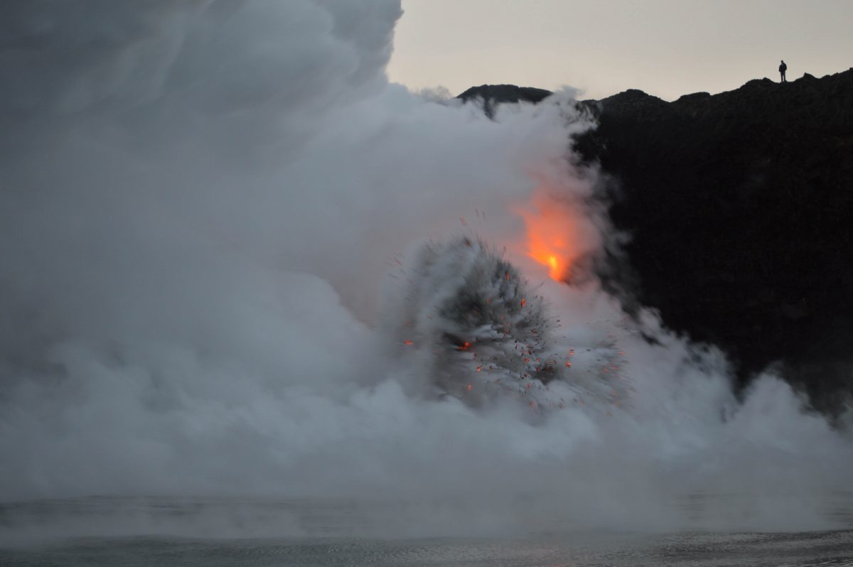 The lava falls poured into the ocean and warmed the surrounding water to a comfortable 112 degrees Fahrenheit. And while I was tempted with a quick swim in the hot-tub like waters, the frequent volcanic explosions at the surface made it so I stayed safely put inside of the boat. These explosions catapulted bright-orange pieces of liquid lava more than 100 feet into the air, at times landing on the cliffs above the falls; and as our eyes focused in on the silhouettes standing at the edge of those cliffs I couldn’t help but worry that those hikers were standing just a little bit too close.