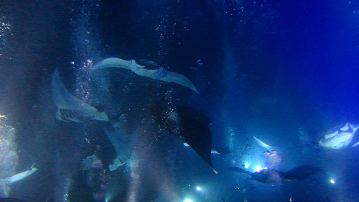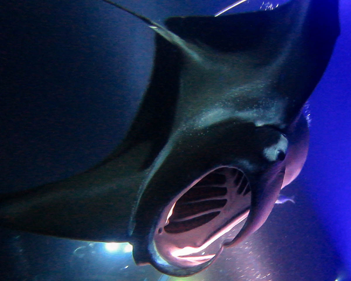 The night was calm and the moon was full, and as we geared up for our second dive of the night excited squeals and murmurs could be heard among the many snorkelers at the surface. Our dive master quickly went over the facts during our dive briefing: manta rays eat plankton, and plankton are attracted to light. So our goal was to flood the area with light in order to draw in the plankton, thus providing a delicious buffet for our Manta friends. He added that unlike sting rays and eagle rays, manta rays do not have stingers on their tails, and he continued to put the divers’ minds to ease by stating that manta rays can’t actually “eat” humans. 🙂 While the mouth of the manta ray is gigantic, the esophagus is not, so if one tried to swallow us, the manta would just choke and spit us out. 🙂